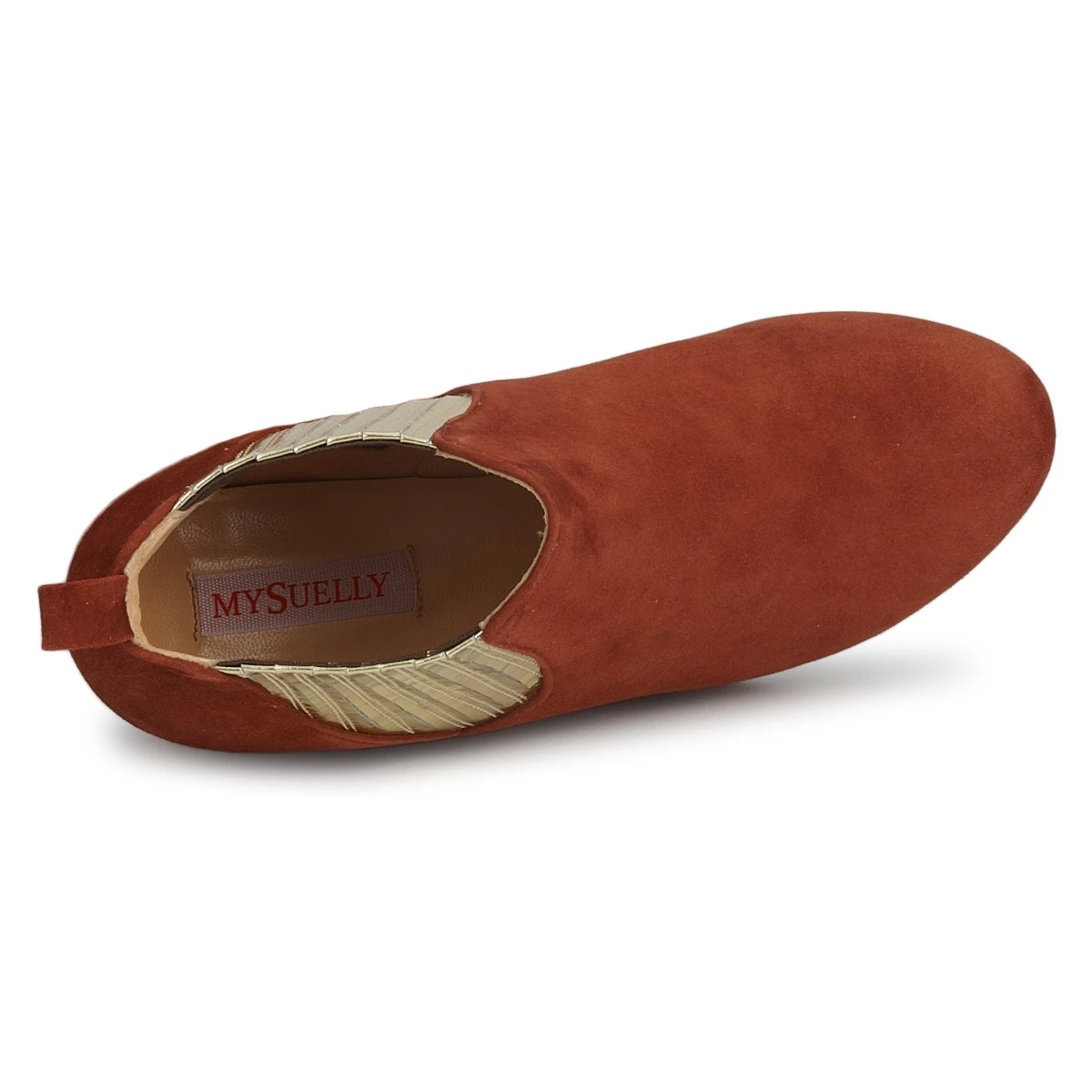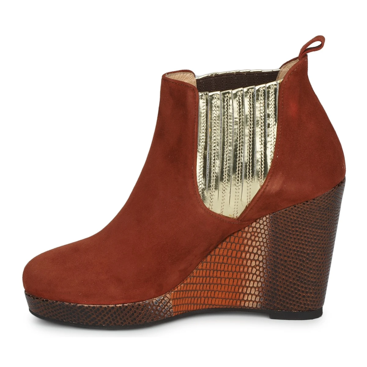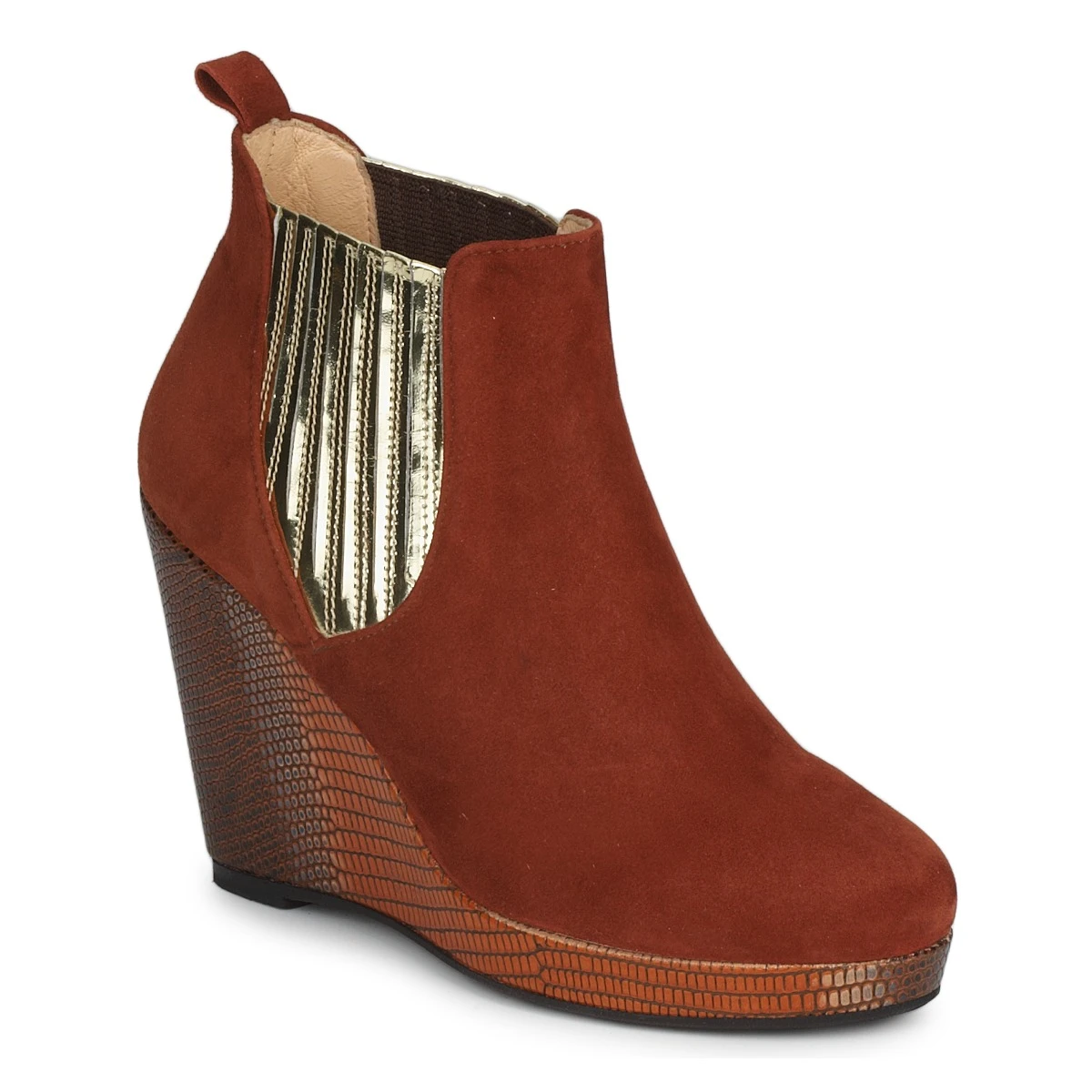 MySuelly s’amuse avec les codes de la chelsea boot cette saison. Montée sur une semelle plateforme et un talon compensé à l’imprimé croco, et dotée d’un élastique d’aisance recouvert de lames dorées, elle joue l’audace chic !
